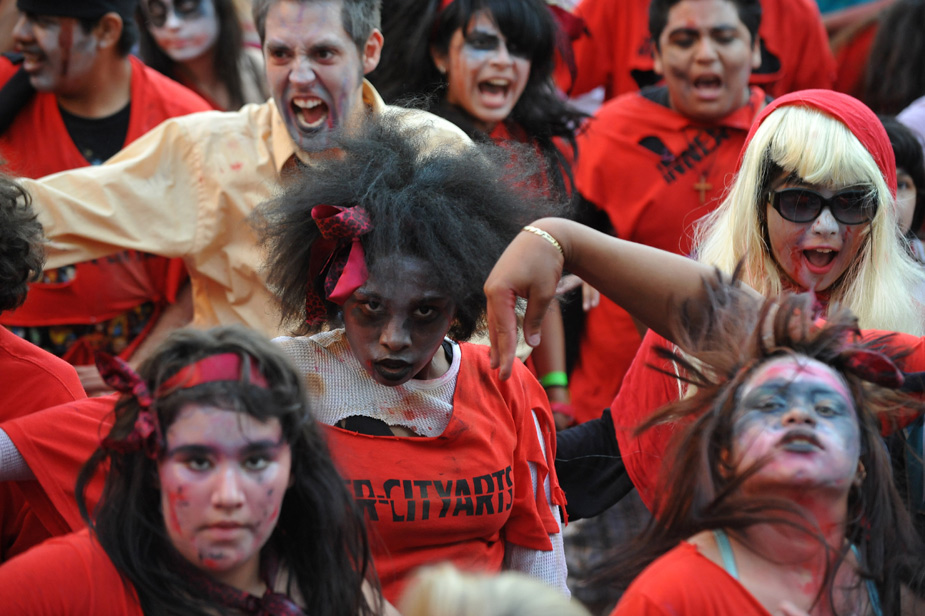25日,“戰栗全世界”活動在全球300多座城市同期舉行,全球一共有大約20000人同時跳起了邁克·杰克遜著名的戰栗舞。圖片來源:中國新聞網