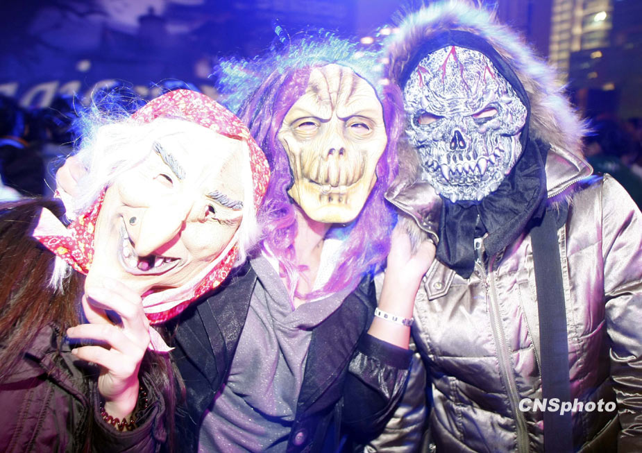 10月31日是西方的“萬圣節”,世界各地的群眾穿著奇異的服飾、打扮鬼魅的造型迎接“鬼節”的到來。在北京青年們聚集在一起狂歡,迎接萬圣節。中新社發 楊可佳 攝
