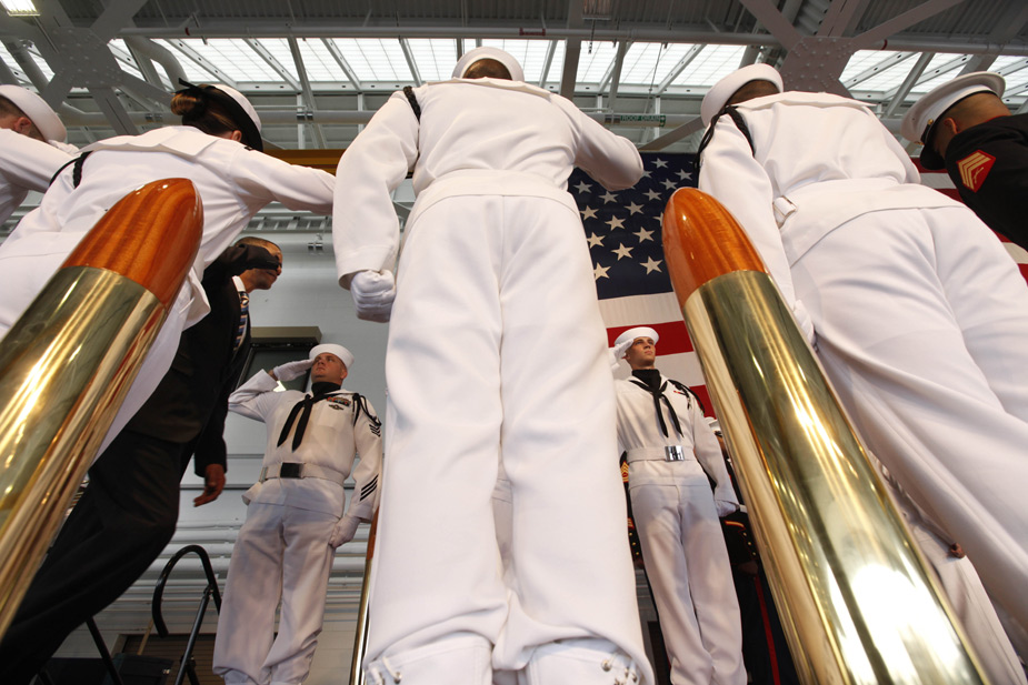 周一(26日),美國總統奧巴馬慰問海軍士兵。 來源:中國新聞網