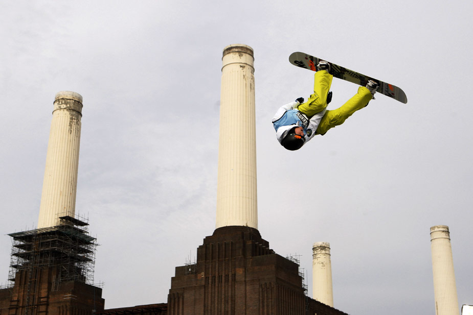周五(30日),英國一位滑雪板高手在倫敦的一個電站前參加世界杯滑雪板比賽。 來源:中國新聞網