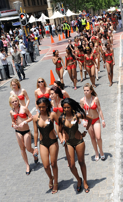 11月7日,南非女性著比基尼沿著梅爾羅斯門大道游行了1690米,在打破吉尼斯世界記錄的同時提醒婦女提高防范乳腺癌的意識。圖片來源:中國新聞網
