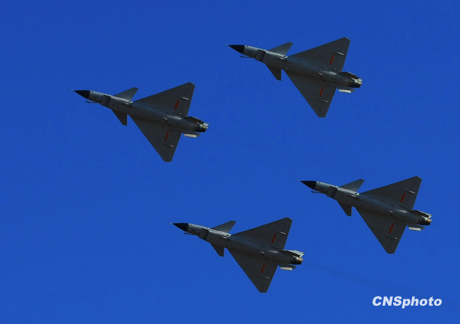 慶祝中國人民解放軍空軍成立60周年飛行表演,11月15日上午在北京沙河機場舉行。表演按八一飛行表演隊4架殲-10飛機表演12個動作和6架殲-7GB飛機表演15個動作,分四機對頭交叉、四機菱形隊大坡度盤旋、單機小速度平飛等27個動作,其中四機對頭交叉動作是這次表演中技術難度較大的動作之一,這是國產三代飛機和國產二代飛機首次同場競技表演。圖為八一飛行隊殲-10進行表演。中新社發 宋吉河 攝
