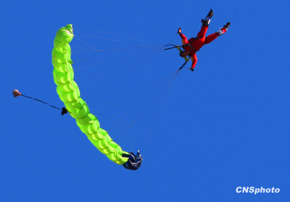 慶祝中國人民解放軍空軍成立60周年飛行表演,11月15日上午在北京沙河機(jī)場舉行。表演按八一飛行表演隊4架殲-10飛機(jī)表演12個動作和6架殲-7GB飛機(jī)表演15個動作,分四機(jī)對頭交叉、四機(jī)菱形隊大坡度盤旋、單機(jī)小速度平飛等27個動作,其中四機(jī)對頭交叉動作是這次表演中技術(shù)難度較大的動作之一,這是國產(chǎn)三代飛機(jī)和國產(chǎn)二代飛機(jī)首次同場競技表演。空軍跳傘運(yùn)動大隊30名運(yùn)動員表演了4個跳傘科目。中新社發(fā) 宋吉河 攝