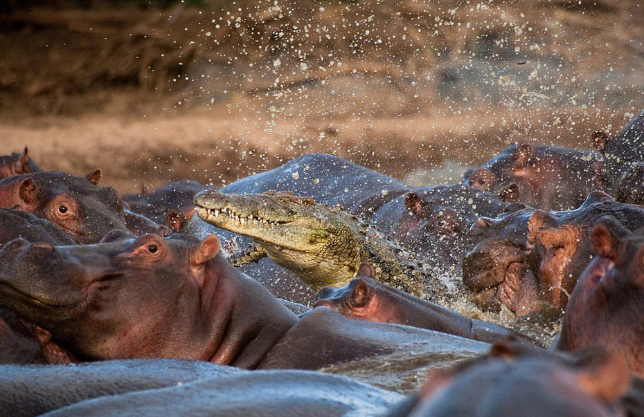 45歲的捷克野生動物攝影師Vaclav Silha日前在坦桑尼亞塞倫蓋蒂國家公園里拍攝到了非常令人震撼的場面。當時,一條鱷魚悄悄混入了一群正在河里洗澡的河馬中,但由于與一頭帶著小河馬的河馬媽媽太過接近,它很快就被敏感的母河馬發現。憤怒的河馬們立刻對它發起了猛烈地攻擊,這條冒失的鱷魚很快死于非命。這組照片中的一張最早刊登于英國廣播公司(BBC)《野生動物》雜志的11月號。