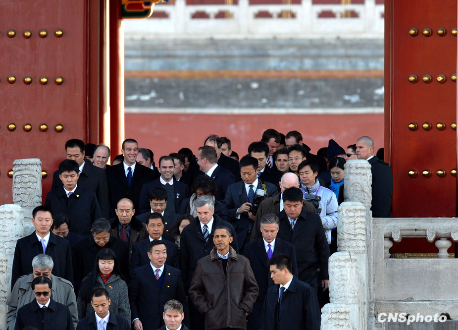 11月17日,正在中國進行國事訪問的美國總統(tǒng)奧巴馬一行參觀北京故宮。圖片來源:中國新聞網(wǎng)