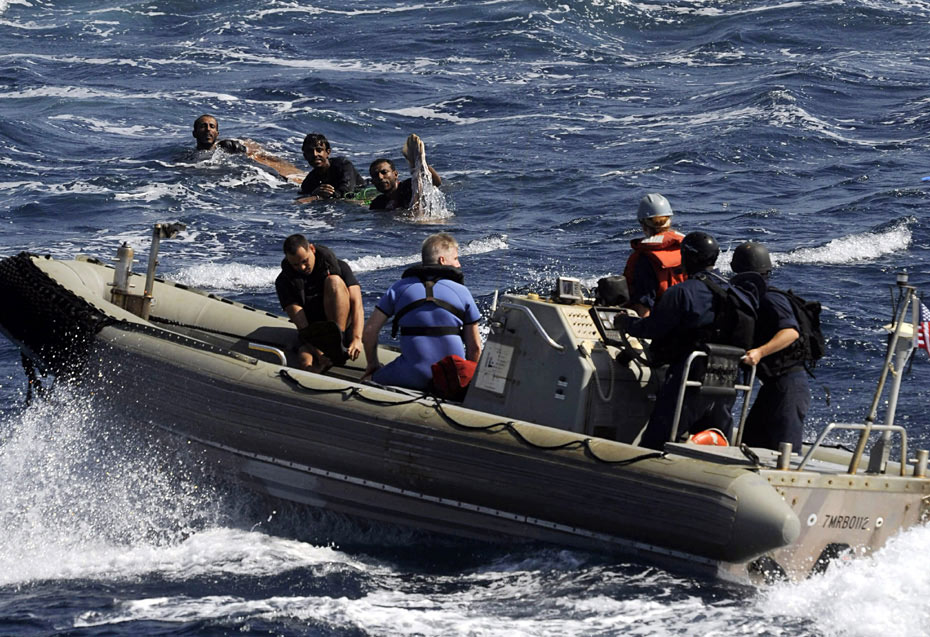 11月17日,亞丁灣,3名漁民抱著木板在海面上漂流3天后獲救。據悉,他們遭遇了十幾名名疑似海盜的劫持,海盜們讓其選擇或跳海逃生或被殺死。圖片來源:中國新聞網