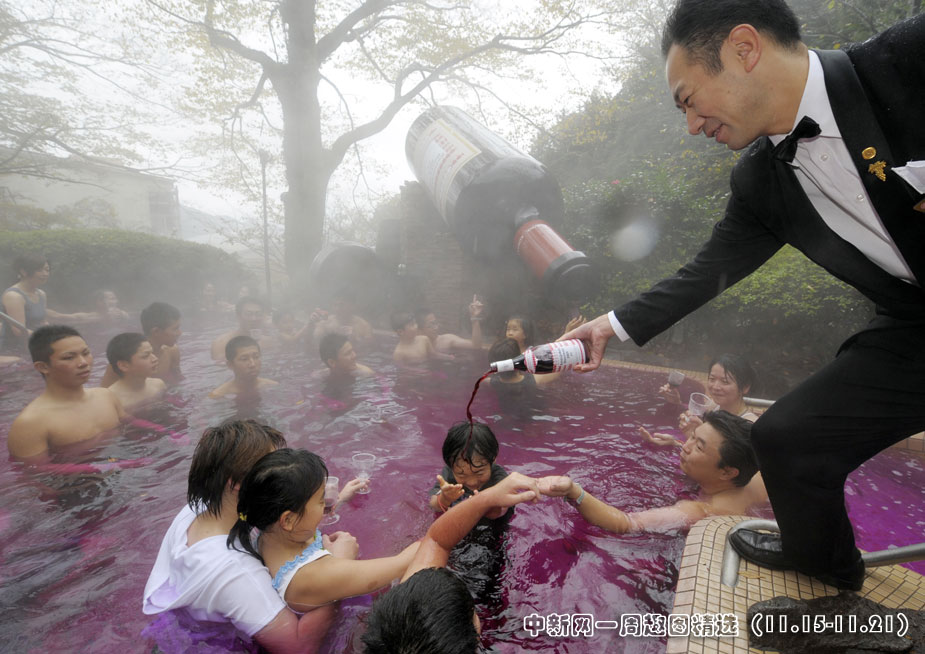 日本神奈川縣箱根小涌園SPA會所從11月19日開始舉行為期12天的戶外美酒溫泉浴。圖片來源:中國新聞網>>點擊觀看詳細內容