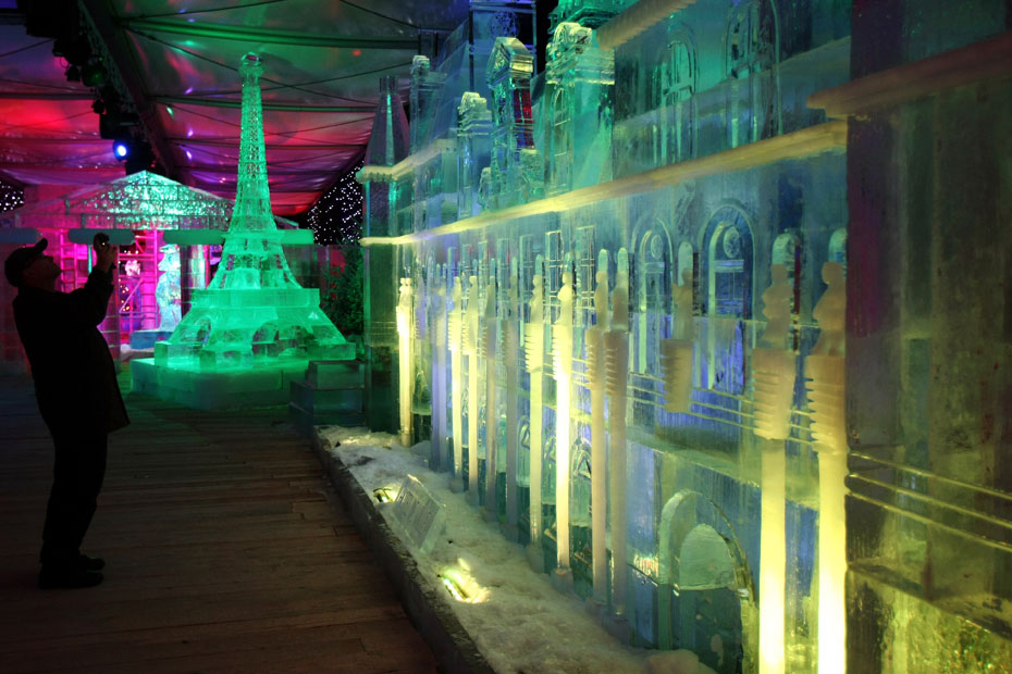 11月23日,為期一個月的“冰之魔術”藝術展在法國巴黎香榭麗舍開幕,16位藝術家利用440噸冰雕刻出精美的巴黎地標建筑和著名藝術家羅丹的“思想者”雕塑。圖片來源:中國新聞網