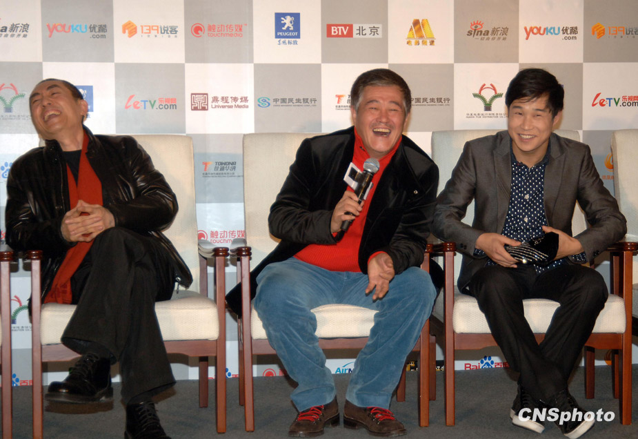 12月9日下午,張藝謀喜劇新作《三槍拍案驚奇》在京舉行首映發布會,導演張藝謀、大病初愈的趙本山攜孫紅雷、小沈陽、閆妮、倪大洪、程野、毛毛全明星主創團隊齊齊亮相。現場張藝謀、趙本山、小沈陽搞笑不斷,引得爆笑連連,上演了一出戲外喜劇。趙本山首度回應了花兩億購買私人飛機一事,稱還沒有定下來。張藝謀表示會和“趙家班”繼續深度合作,并且豪言預計未來的中國電影單部影片票房可能達到2億美元。圖為張藝謀、趙本山、小沈陽成為“笑彈”。中新社發 李學仕 攝