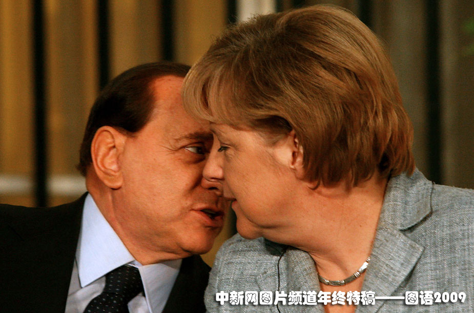貝魯斯科尼與默克爾親密交談:2009年1月18日,以色列總理奧爾默特舉行記者發布會宣布停火時,意大利總理貝盧斯科尼(左)和德國總理默克爾親密交談。