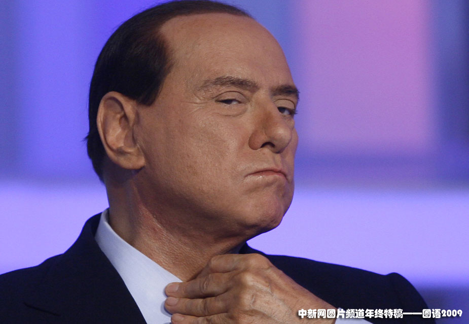 瀟灑的貝魯斯科尼:2009年9月25日,意大利總理貝魯斯科尼在接受電視采訪時整理領帶。貝魯斯科尼一直緋聞纏身,妻子也離他而去。