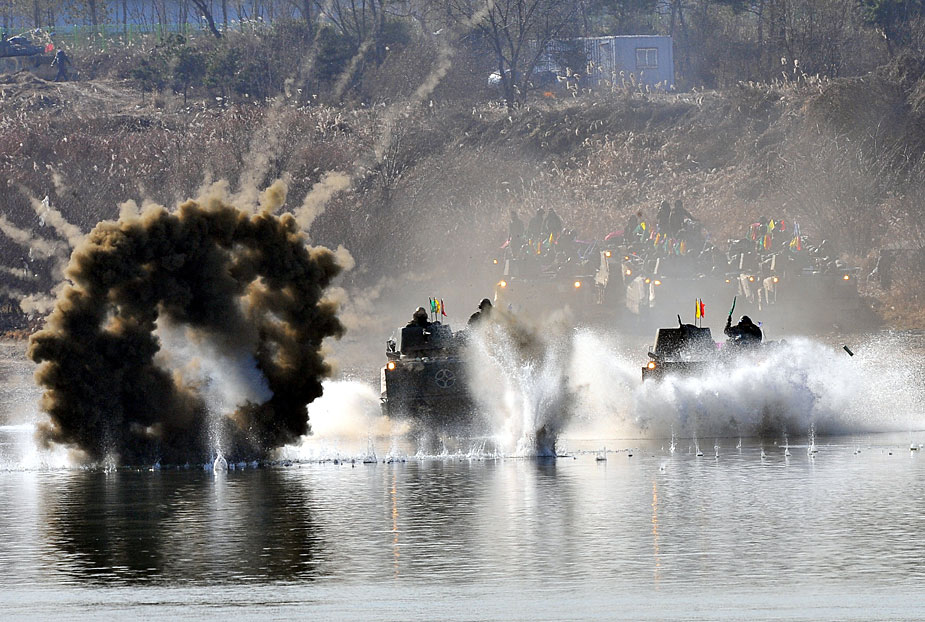 12月16日,韓國第20師團機械化部隊在京畿道驪州南漢江一帶進行大規模渡河實戰訓練。該訓練以培養戰斗執行能力為重點。圖片來源:中國新聞網