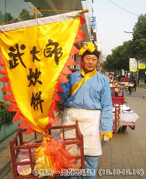 12月18日,46歲的山東省陽谷縣李振生,身著青衣襟、白圍裙、黃頭巾,肩挑貨擔裝扮成武大郎的模樣在南京街頭走街串巷賣炊餅。圖片來源:中國新聞網>>點擊觀看詳細內容