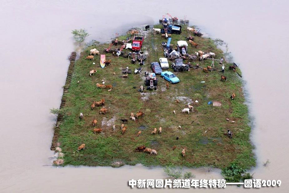 2009年11月8日,隨著雨季來臨,馬來西亞吉蘭丹州的杰拉珀登斯村莊發生洪水,數百名村民被撤離到這一地區。這張圖片是從空中拍攝的,可以看到被洪水圍困的奶牛和汽車。