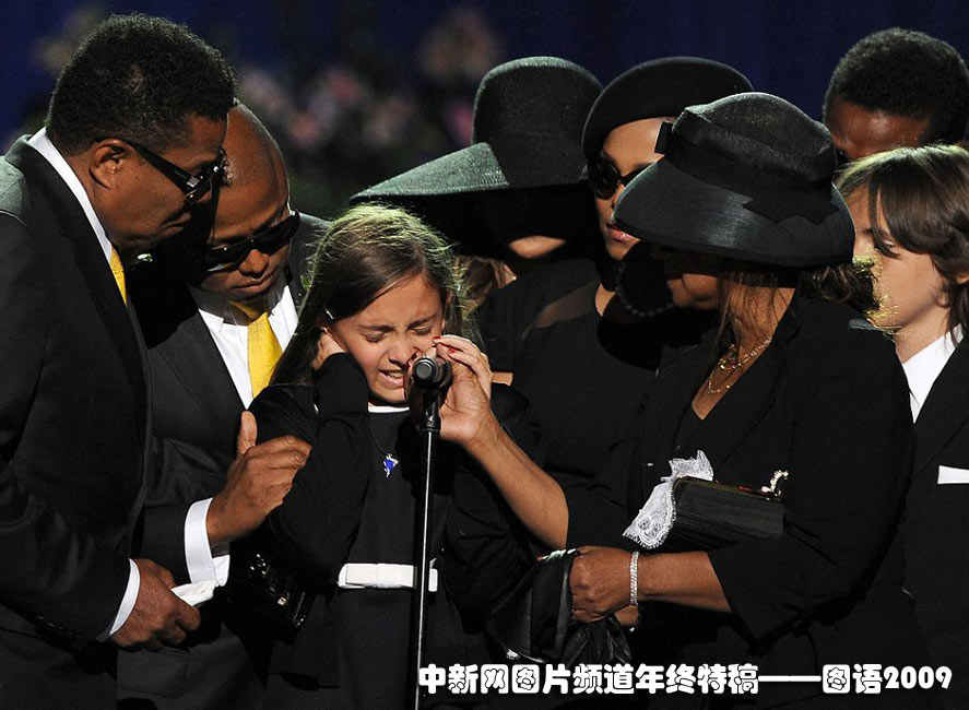 2009年7月7日,在洛杉磯斯坦普斯中心舉行了紀念邁克爾·杰克遜的追思會。邁克爾·杰克遜是樂壇傳奇,死于2009年6月25日。追思會上,邁克爾·杰克遜的家族成員正在安慰的杰克遜的女兒帕麗斯(中)。