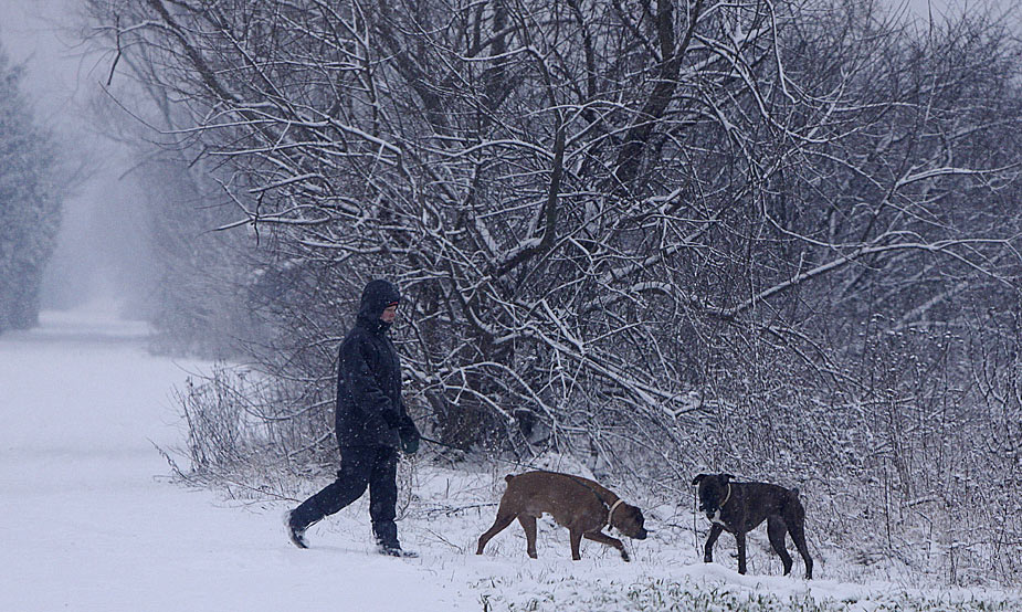 圖為12月29日,波蘭首都華沙人們在雪中溜狗。