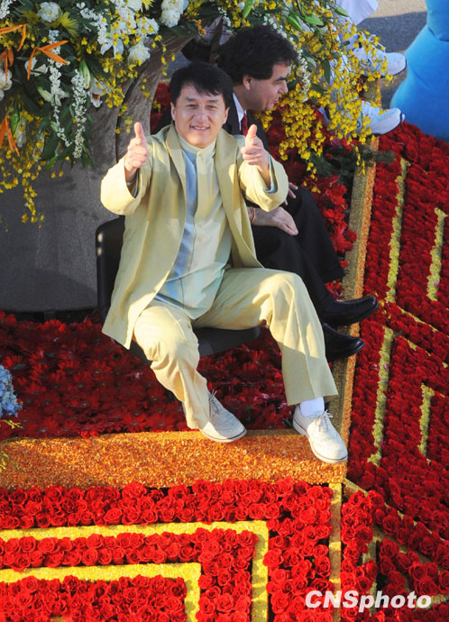 美國當?shù)貢r間1月1日,第121屆美國玫瑰花車大游行在加州帕薩迪納市隆重舉行。著名影星成龍助陣中國上海世博花車。圖片來源:中國新聞網(wǎng)
