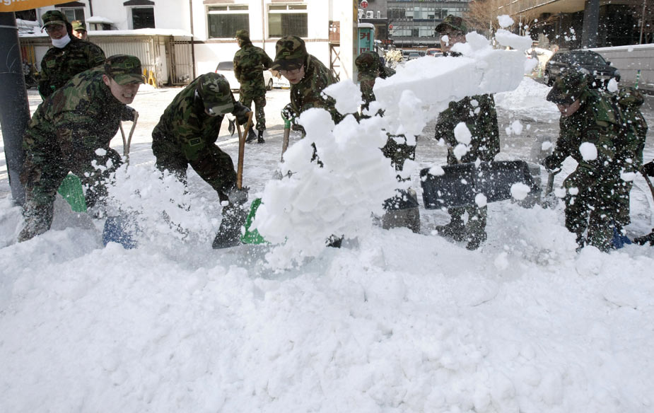 四日,韓國大部分地區遭遇大雪。至下午二時左右,首爾地區積雪厚度超過二十八厘米,這是韓國自一九三七年開始進行積雪量觀測以來的最新紀錄。圖為1月5日,韓國士兵在街頭除雪。