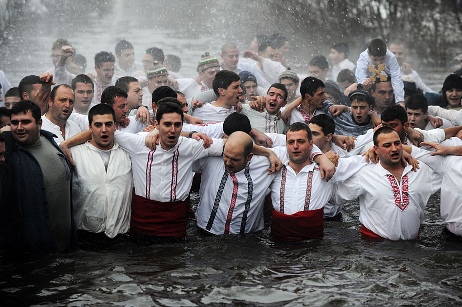 1月6日,在保加利亞卡洛菲爾市,人們在冰冷的河水中跳起保加利亞民間舞蹈霍洛舞,相互祝福在新的一年里身體健康,事事順?biāo)臁D片來源:中國新聞網(wǎng)
