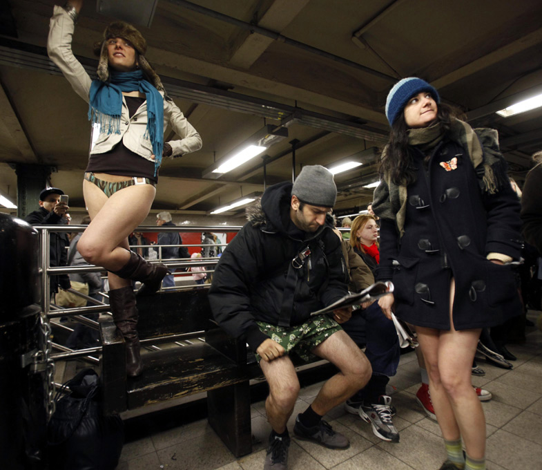 2010年1月10日,紐約,地鐵里一群不穿褲子的乘客。第9屆“不穿褲子乘地鐵”活動當日在全球16個國家的44座城市舉行。圖片來源:中國新聞網
