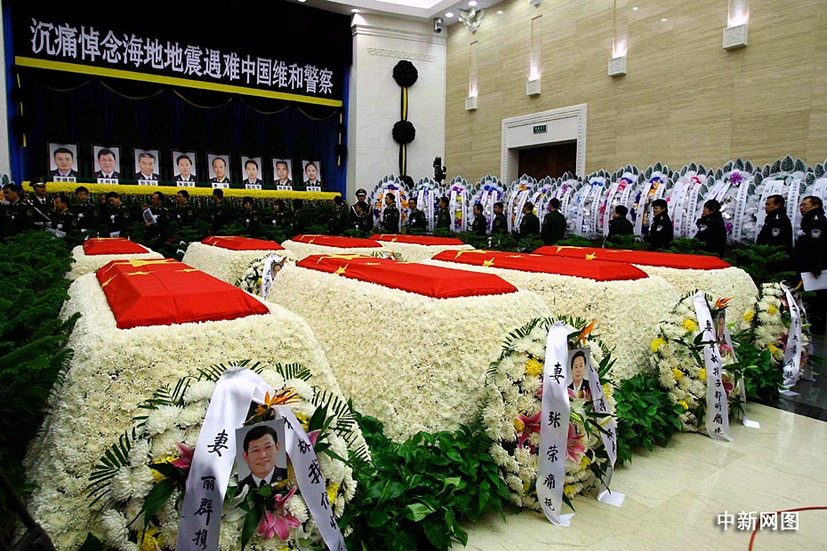 海地地震遇難中國維和警察遺體告別儀式1月20日上午9時在北京八寶山殯儀館大禮堂舉行。圖片來源:中國新聞網(wǎng)
