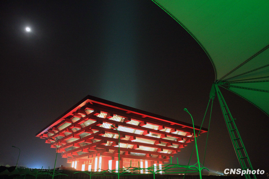 上海世博園“一軸四館”燈火通明,中國館、世博主題館,世博中心、陽光谷等同時亮燈。中新社發(fā) 潘索菲 攝