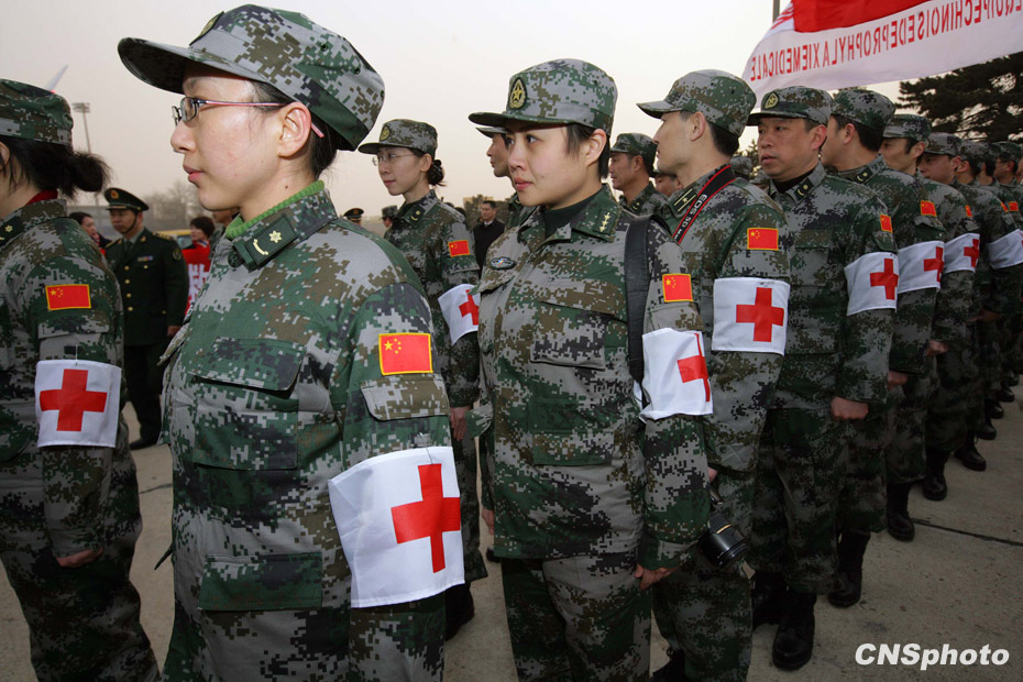 中國人民解放軍醫護人員和管理人員組成的中國醫療防疫救護隊一行40人乘坐軍運包機離開北京,啟程前往海地進行人道主義救援任務。中新社發 劉震 攝