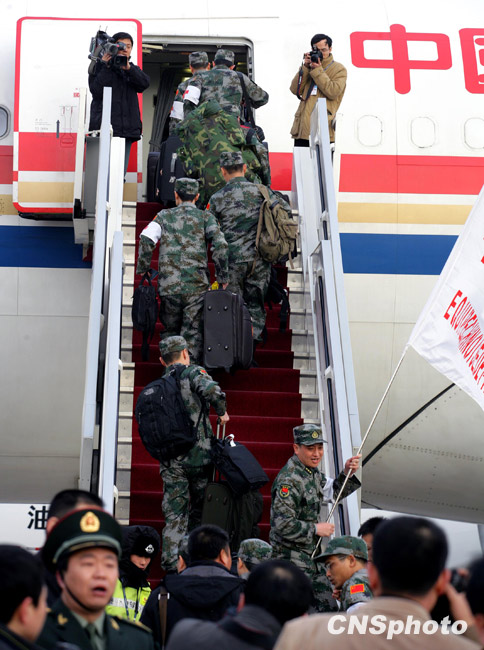 中國(guó)人民解放軍醫(yī)護(hù)人員和管理人員組成的中國(guó)醫(yī)療防疫救護(hù)隊(duì)一行40人乘坐軍運(yùn)包機(jī)離開北京,啟程前往海地進(jìn)行人道主義救援任務(wù)。中新社發(fā) 劉震 攝