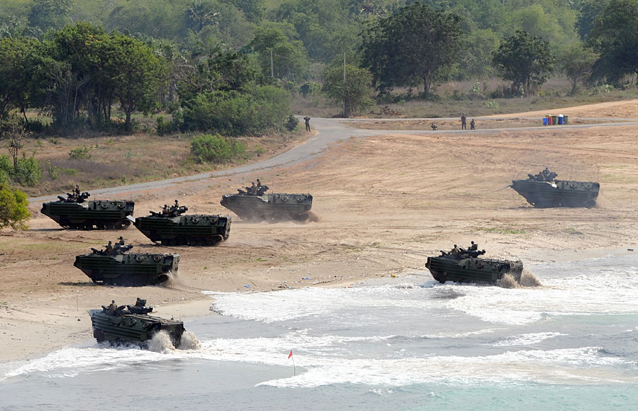 2月4日,參加“金色眼鏡蛇”聯(lián)合軍演的各國軍隊,在泰國的Rayong省沙灘進行了兩棲登陸演練。本次聯(lián)合軍演共有來自泰國、美國、印度尼西亞、新加坡、日本、韓國的約1.4萬名軍人參加。圖片來源:中國新聞網(wǎng)