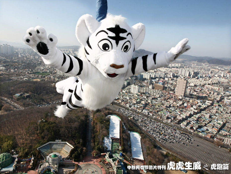1月3日,為慶祝時隔60年迎來的白虎年,韓國大邱市民身穿白虎服裝跳蹦極,向人們致以新年的問候。圖片來源:CFP