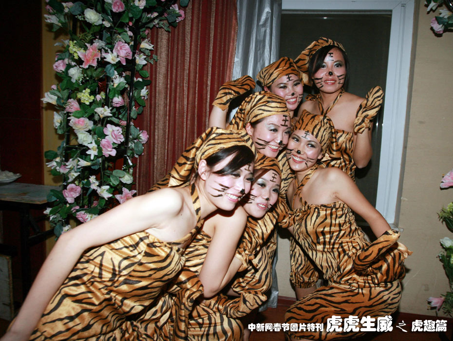 2月4日晚,河南鄭州,7只美麗的“老虎”在舞臺上表演千手觀音等節目,這些“老虎”都是由鄭州商都婦產醫院的女護士變身而成,為了迎接虎年新春的到來,她們自己制作出虎皮等飾品裝扮成老虎模樣虎虎生威迎新春。中新社發 王中舉 攝