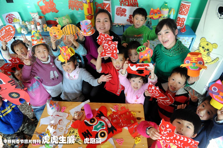 1月13日,北京西城區(qū)一所幼兒園的小朋友在老師帶領(lǐng)下制作各種各樣的老虎。他們用舊報(bào)紙、碎布條等廢舊材料制作成各種構(gòu)思奇妙、栩栩如生的手工制品,迎接即將到來的農(nóng)歷虎年。中新社發(fā) 遠(yuǎn)舟 攝