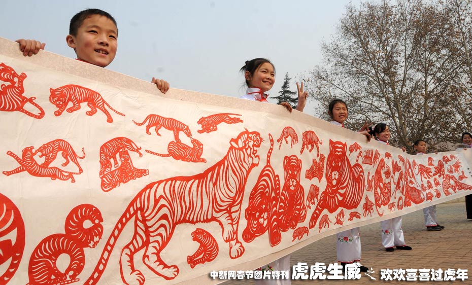 2月4日上午,洛陽市中州西路小學師生展示10米民間剪紙長卷《百虎爭春》圖。中新社發 張光輝. 攝