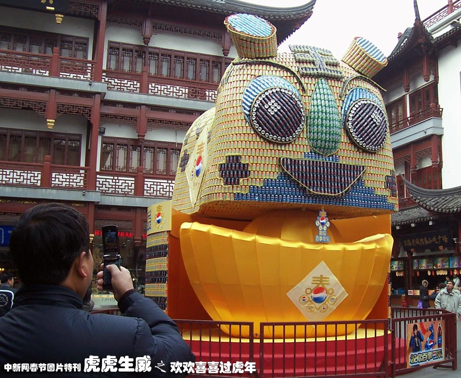 1月5日,一只用數萬個易拉罐搭成的高達七米的卡通虎亮相上海豫園商城廣場,迎接虎年新春的到來,吸引中外游客觀賞留影。中新社發 周東潮 攝