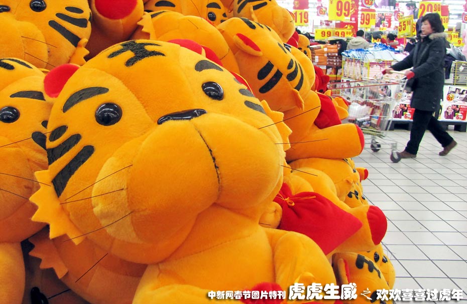 1月8日,上海一家超市內(nèi)出售的“老虎”玩具。隨著農(nóng)歷虎年的臨近,各類以老虎為主要元素的飾品和玩具紛紛已上市并熱賣。 中新社發(fā) 井韋 攝