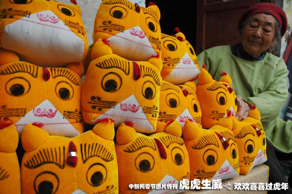 1月19日,河南省淮陽縣民間老藝人馬玲賢與她制作的“布老虎”在一起。今年85歲的馬玲賢老太太制作“布老虎”已經有近20年,她制作的“布老虎”工藝精良,造型天稚氣可愛。中新社發 楊正華 攝
