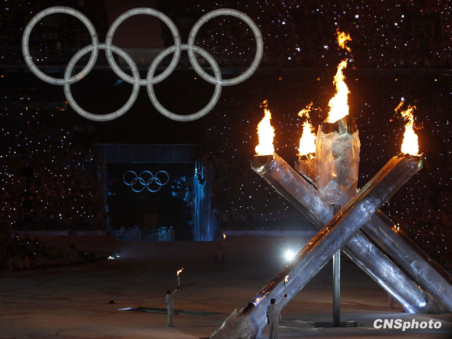 圖為溫哥華冬奧會主火炬在體育館內(nèi)點燃。