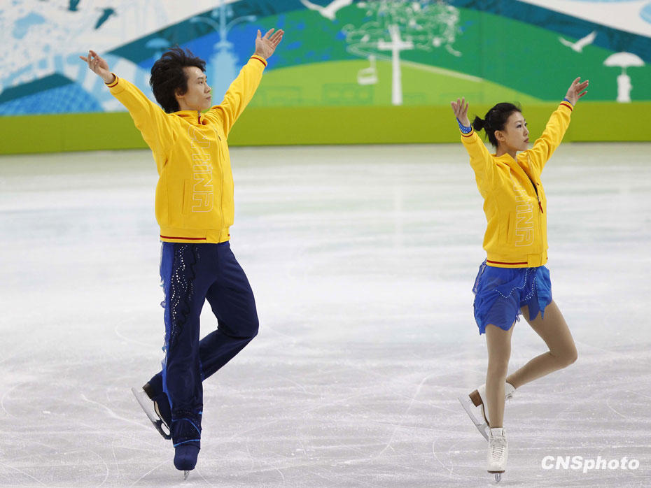 當(dāng)?shù)貢r(shí)間2月13日,中國花樣滑冰隊(duì)龐清/佟健、張丹/張昊在溫哥華太平洋體育館,利用最后的休息時(shí)間重復(fù)練習(xí)積極備戰(zhàn)即將到來的比賽。中新社記者 盛佳鵬 攝