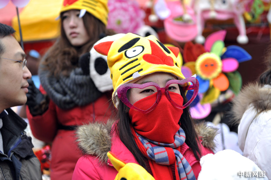 2月14日,農歷正月初一,北京各大傳統廟會、洋廟會爭相開幕,許多游客頭戴虎年飾品開心游廟會。中新網記者 金碩 攝