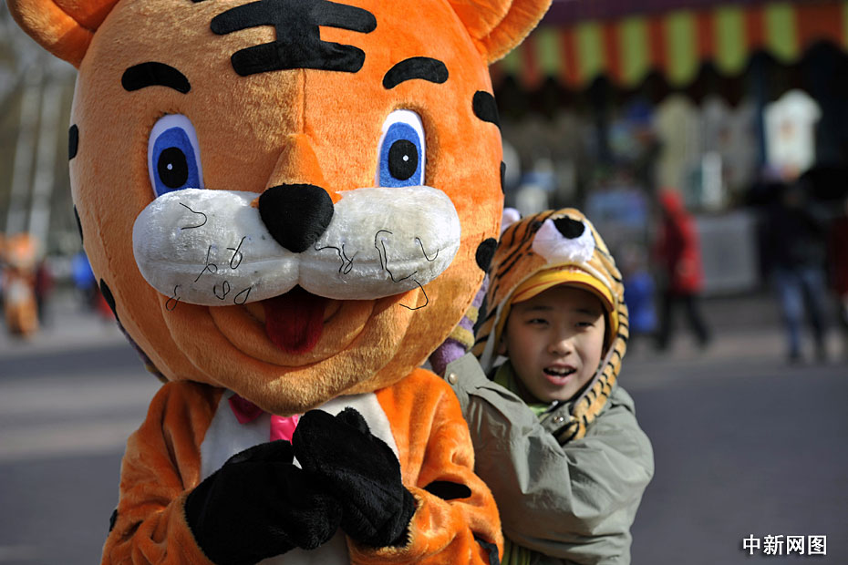 2月14日,農歷正月初一,北京各大傳統廟會、洋廟會爭相開幕,許多游客頭戴虎年飾品開心游廟會。中新網記者 金碩 攝