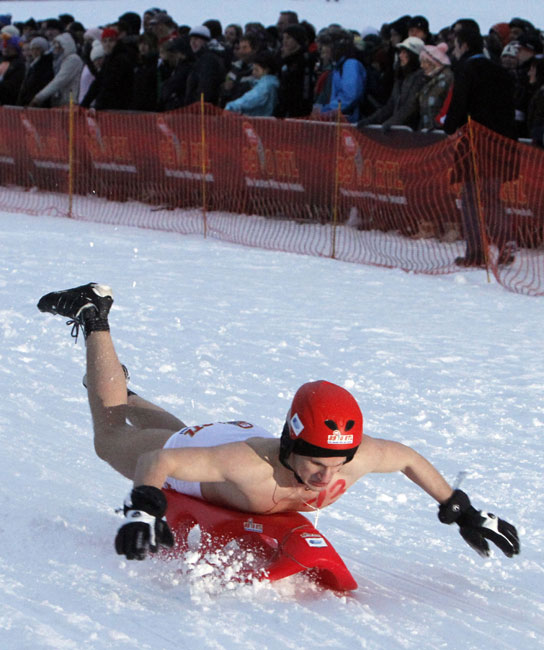 近日,在德國北部小鎮舉行了一場別開生面的滑雪大賽,參賽者在冰天雪地中赤裸著上身在滑雪板上滑行。圖片來源:中國新聞網