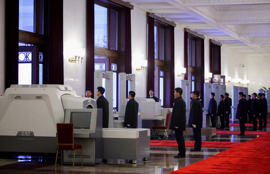 3日下午,全國政協(xié)十一屆三次會議將在北京人民大會堂開幕,2010年全國“兩會”由此正式揭開大幕,目前各項工作準備就緒。圖為人民大會堂的主要入口處的安保人員。Feng Li 攝