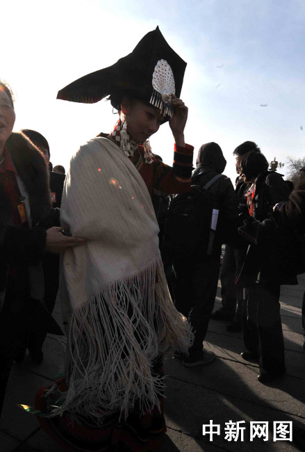 十一屆全國人大三次會議3月5日在北京開幕,各民族人大女代表的服飾靚麗多彩,在天安門廣場前大展英姿。 中新社記者 賈國榮 攝