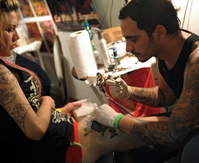 當地時間3月7日,第六屆國際紋身展在阿根廷首都布宜諾斯艾利斯舉行。來自美國、法國、西班牙、墨西哥、智利、巴西等國家的紋身高手前來獻藝。圖片來源:中國新聞網