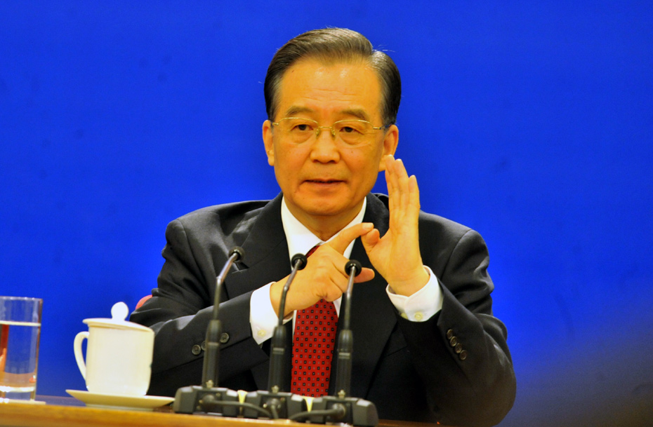3月14日上午,國務(wù)院總理溫家寶在人民大會(huì)堂三樓金色大廳與采訪十一屆全國人大三次會(huì)議的中外記者見面并回答記者提出的問題。中新社記者 賈國榮 攝 圖片來源:中國新聞網(wǎng)