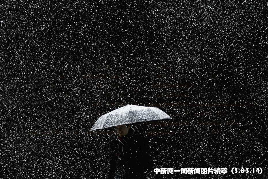 周一,一名男子打著雨傘走在下著大雪的西班牙巴塞羅那街頭。圖片來源:中國新聞網