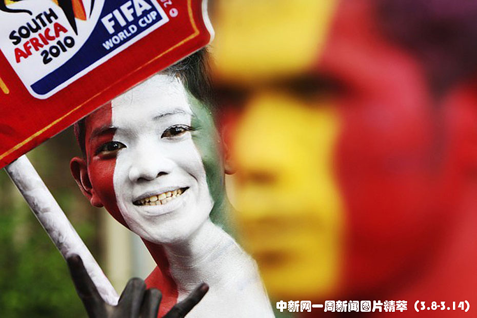 周一在印尼雅加達(dá)舉行的FIFA世界杯足球賽宣傳活動(dòng)上,人們在身上涂上了參賽國家的國旗。圖片來源:中國新聞網(wǎng)