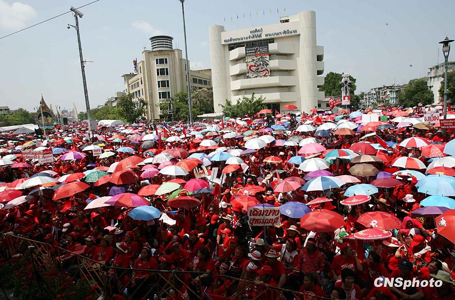 3月13日起,泰國“紅衫軍”陸續從泰國北部、東北部等外府進入曼谷市,在集會主會場搭設演講舞臺和帳篷,拉開大規模示威序幕。圖片來源:中國新聞網