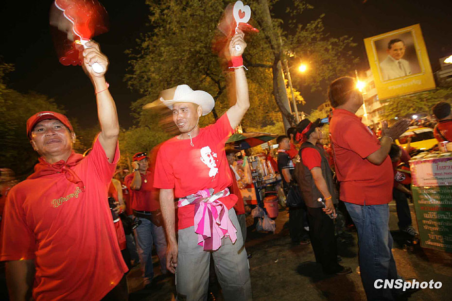 3月13日起,泰國“紅衫軍”陸續從泰國北部、東北部等外府進入曼谷市,在集會主會場搭設演講舞臺和帳篷,拉開大規模示威序幕。圖片來源:中國新聞網