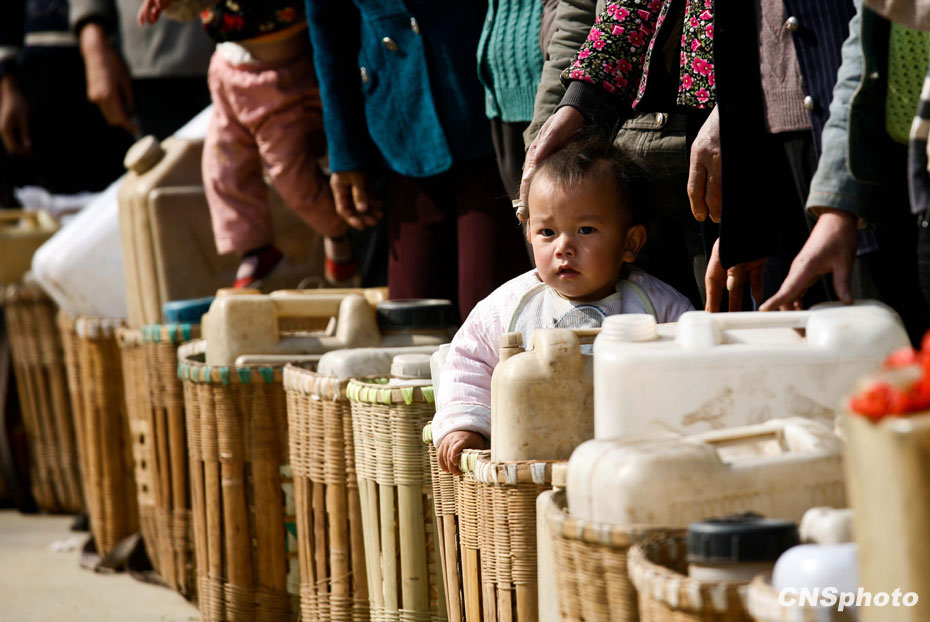 3月12日,云南省富源縣小羊場村,1名兒童隨母親來到村口排隊取水。中新社發 保旭 攝